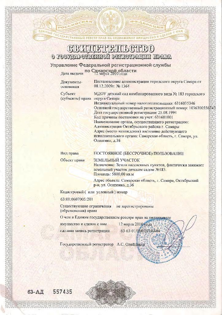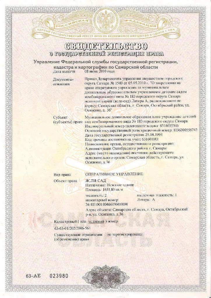 - Распоряжение № 2304 от 11.09.2019г. "Об утверждении Устава муниципального бюджетного дошкольного образовательного учреждения "Детский сад общеразвивающего вида № 183" городского округа Самара